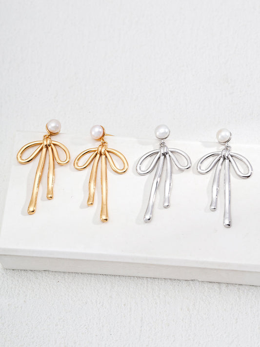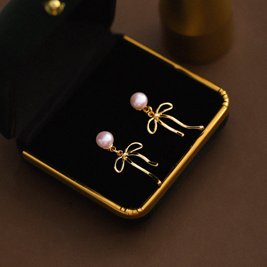 Shiny Bow-Shaped Natural Pearl Earrings – S925 Sterling Silver | Elegant & Chic Design
