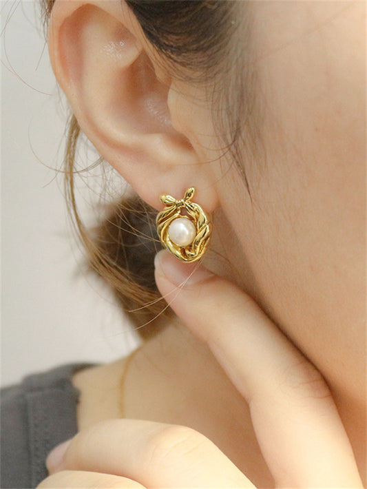 Gold S925 Silver Bow Knot Pearl Stud Earrings