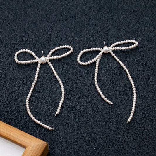 Pearl Bow Tassel Earrings – Oversized Long Statement Dangle with S925 Silver Posts