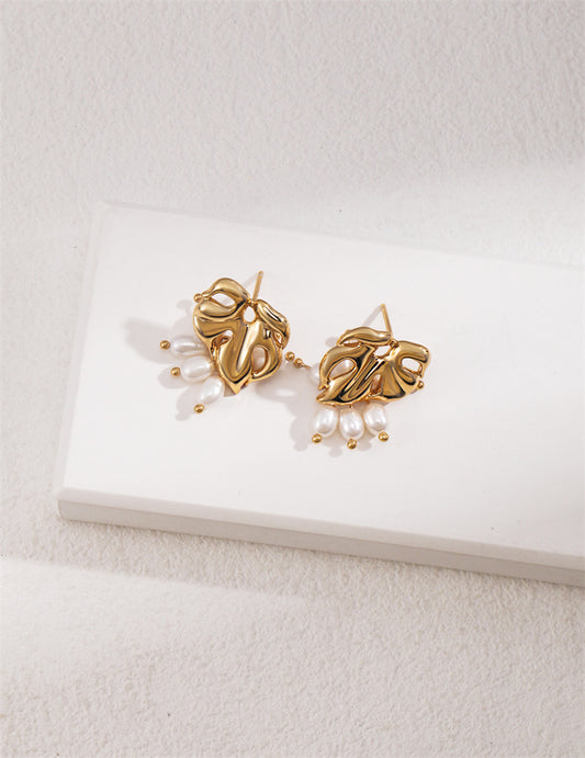 Tropfenohrringe mit Reisperlen im tropischen Monstera-Blatt-Design